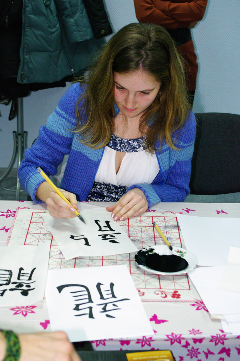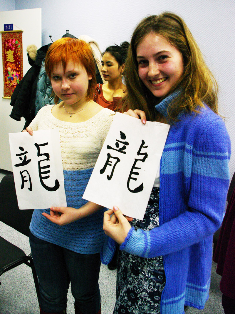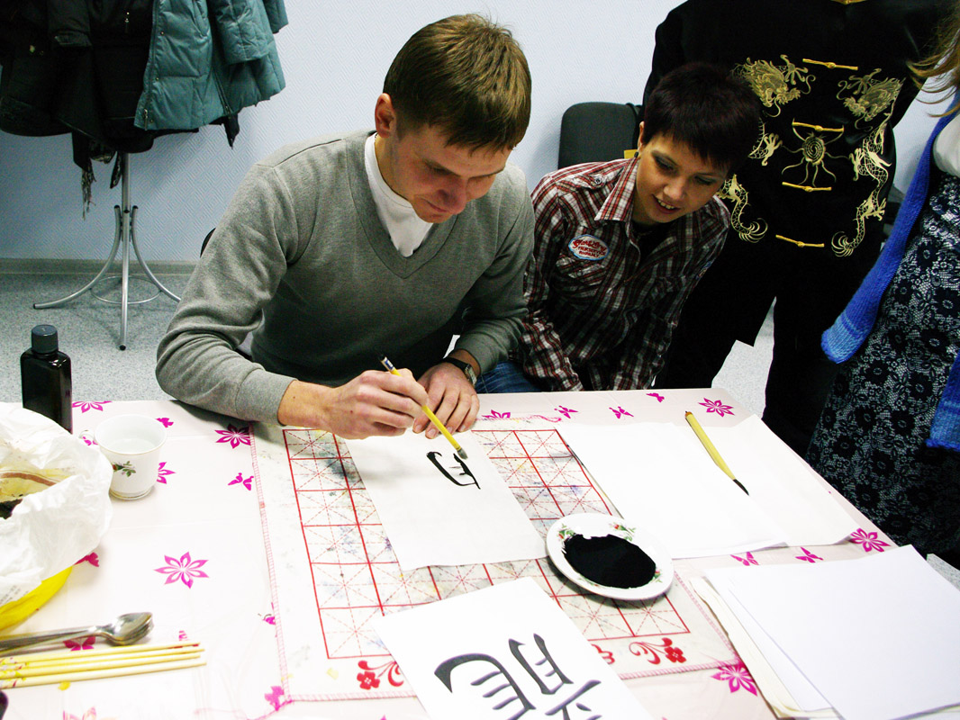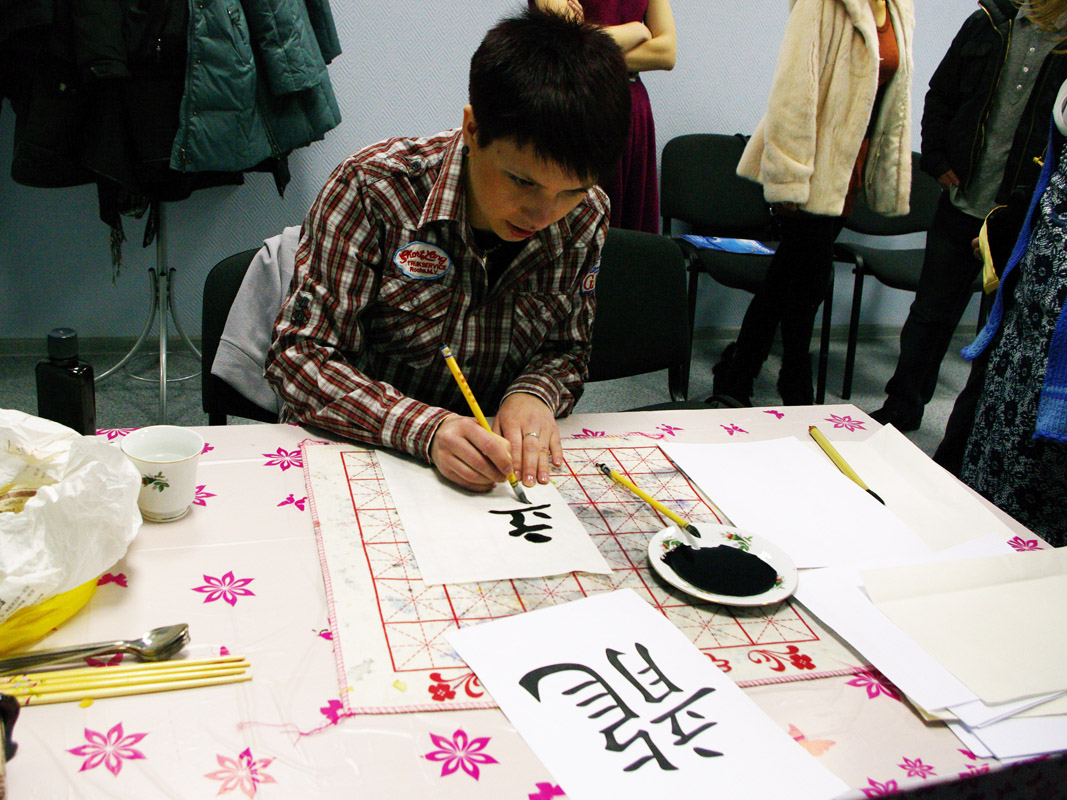 Началась самая ответственная часть мероприятия! Конкурс состоящий из двух этапов с призами финалистам. В первой части участники рисовали на настоящей рисовой бумаге, настоящими каллиграфическими кистями иероглиф «дракон» в его старом исполнении.