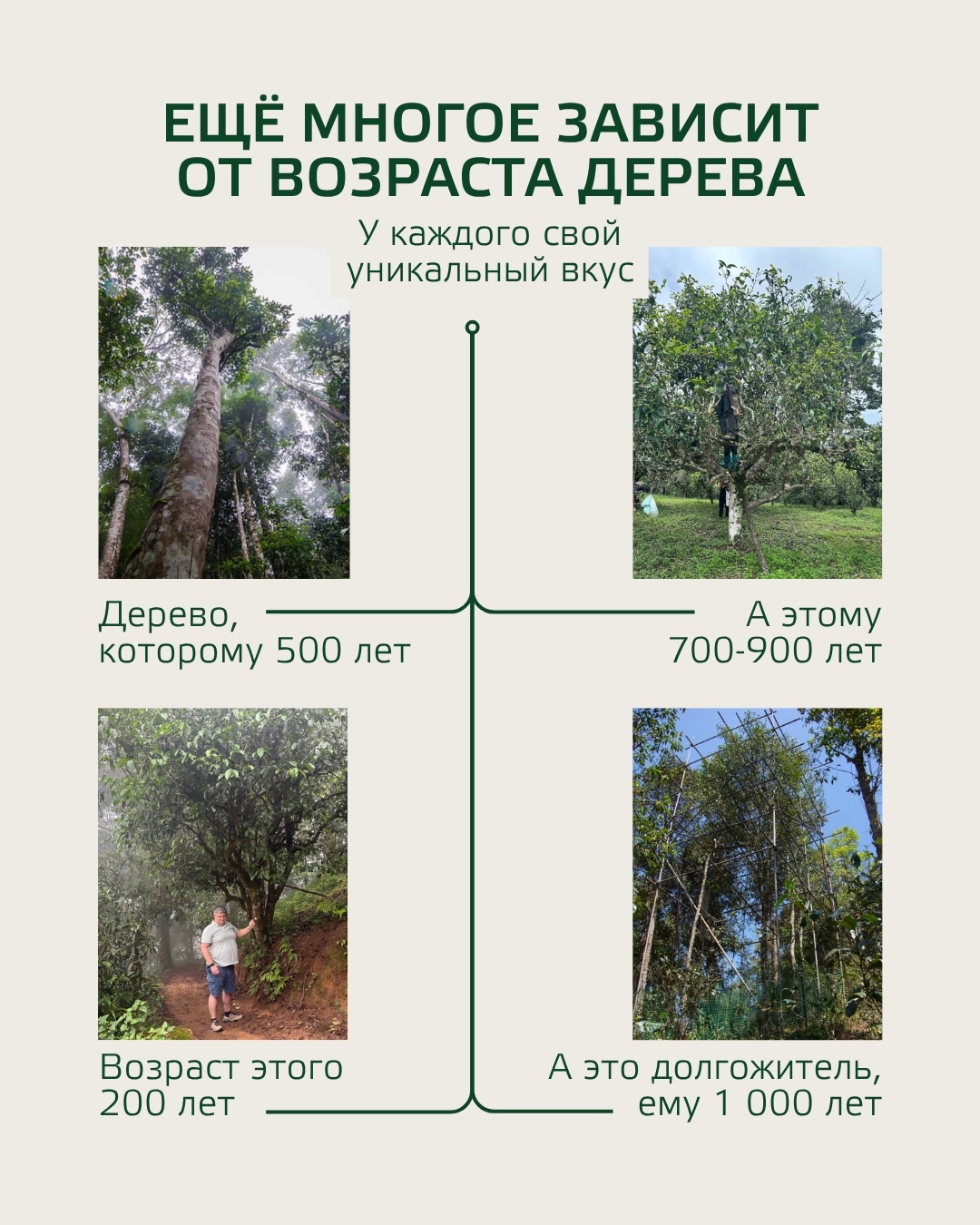 | Д ревние деревья имеют мощную корневую систему, которая вбирает все минералы и микроэлементы, которые делают чай полезным | Молодые деревья не имеют такой развитой корневой системы, поэтому чай “пустой” |